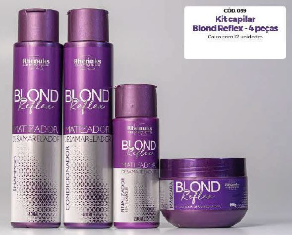 O Kit-Capilar-Blond-Reflex-4pecas-Rhenuks é um conjunto de produtos projetado para elevar a beleza e o brilho dos cabelos loiros. Ele inclui: